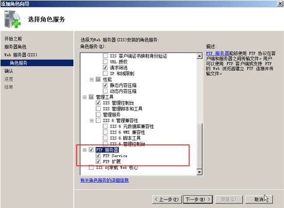 4)勾選【FTP服務(wù)器】(如果不勾選,會造成添加ftp站點的時候沒有這個選項),然后進(jìn)行【下一步】
