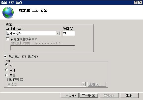 選擇你希望開放的IP地址(默認(rèn)選擇全部未分配,即所以IP都開放)和端口(默認(rèn)選擇21);SSL請根據(jù)您的具體情況選擇,如無需使用SSL,請選擇【無】;選擇【下一步】