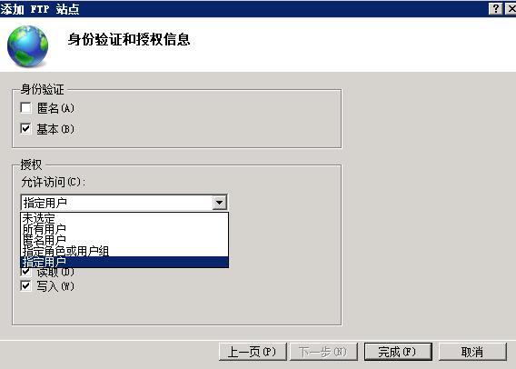 身份驗證請選擇【基本】,不建議開啟【匿名】;授權(quán)中允許訪問的用戶可以指定具體范圍,如果FTP用戶不需要很多的話,建議選擇【指定用戶】,權(quán)限選擇【讀取】和【寫入】;選擇【完成】。