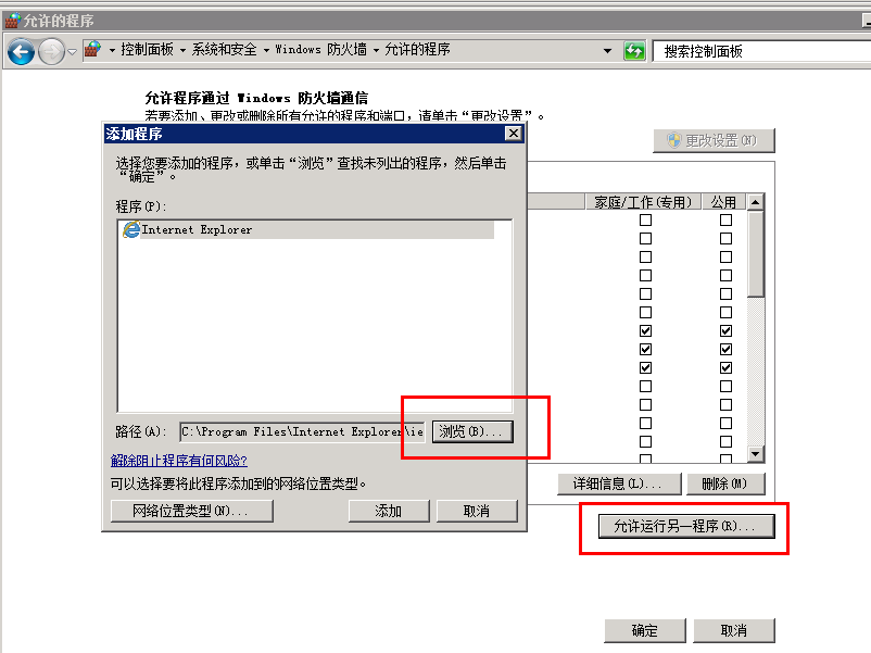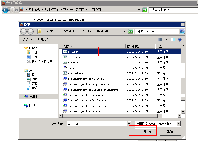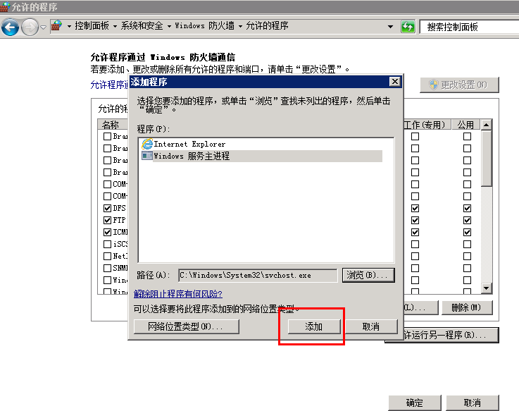 9)選擇允許運行另一程序,在添加程序中選擇瀏覽,選擇C:\windows\system32\svchost.exe就行打開添加,這時windows服務(wù)器主進(jìn)程就添加在防火墻例外中,點擊確定后,這時就可以從外網(wǎng)訪問ftp。