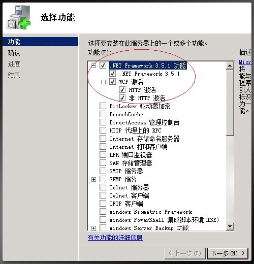 點擊功能->"添加功能"->勾選“.NET Framework 3.5.1功能”,如下圖