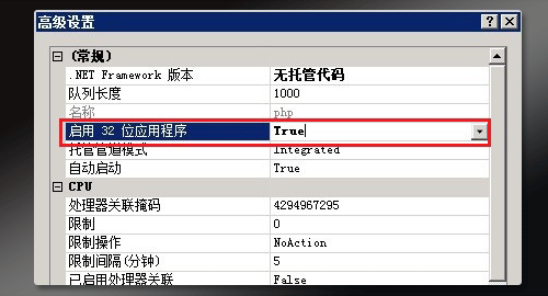 添加完成后,右鍵點擊創(chuàng)建的php進程池->高級設置,設置“啟動32位應用程序”為“true”,否則會報錯:“HTTP 錯誤 404.17 - Not Found”