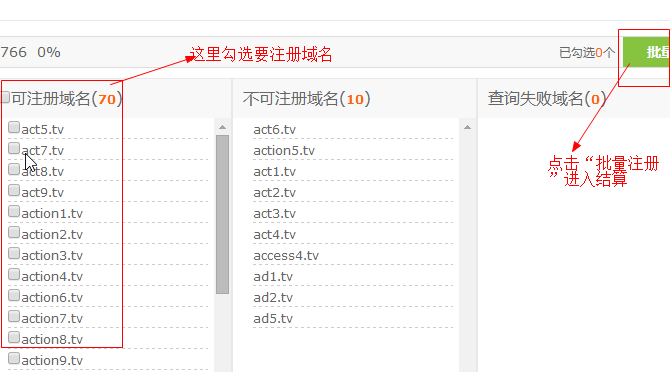 回答:如圖,勾選可注冊(cè)的域名,點(diǎn)擊“批量注冊(cè)”即可將所選域名加入購(gòu)物車結(jié)算。