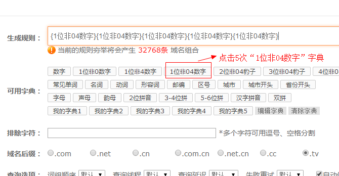 回答:如圖,在查詢標(biāo)簽中,點(diǎn)擊5次“1位非04數(shù)字”標(biāo)簽。→選擇要查詢的域名后綴→點(diǎn)擊“開始查詢”。