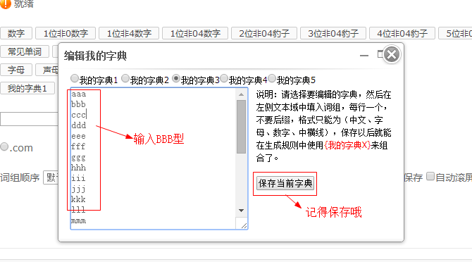 再點(diǎn)擊字典2,在字典3中輸入aaa、bbb、ccc、ddd……等26個(gè)字母,保存當(dāng)前字典。