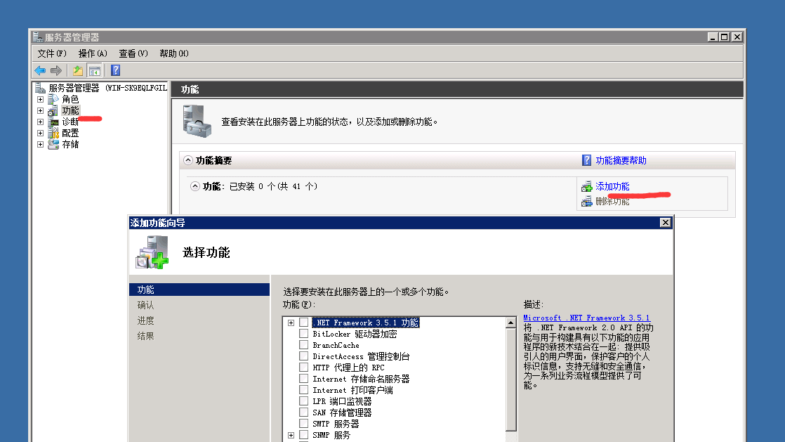 選擇需要安裝的信息 這里選擇安裝 .net3.5 然后下一步 選擇iis 安裝需要的功能