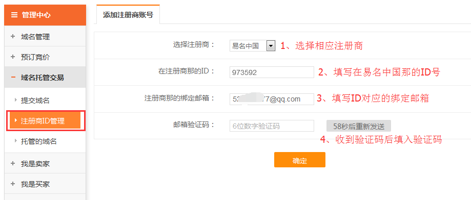 1.2在“添加注冊(cè)商賬號(hào)”頁面選擇注冊(cè)商、填寫注冊(cè)商的ID及在其他注冊(cè)商那的郵箱進(jìn)行驗(yàn)證添加,如圖所示