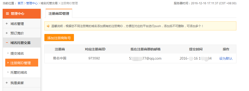 1.1在“管理中心--域名托管交易--注冊(cè)商ID管理”中點(diǎn)擊“添加注冊(cè)商賬號(hào)”。