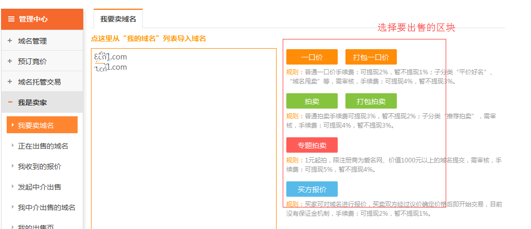 步驟1:當(dāng)在“管理中心--我是賣家--我要賣域名”中輸入/在列表中選擇想要進行出售的托管域名,如圖所示: