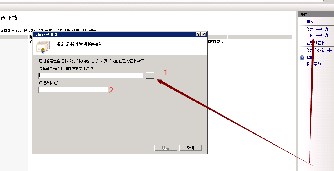 1. 完成證書申請 打開 IIS 控制臺界面,點(diǎn)擊右側(cè)邊欄“完成證書申請”選項(xiàng),按照下圖進(jìn)行配置。