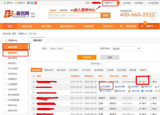 2. 進入管理中心,點擊左側(cè)管理中心菜單,點擊 【域名管理】--- 選擇【我的域名】,在域名列表選擇操作那欄,選擇【域名管理】;