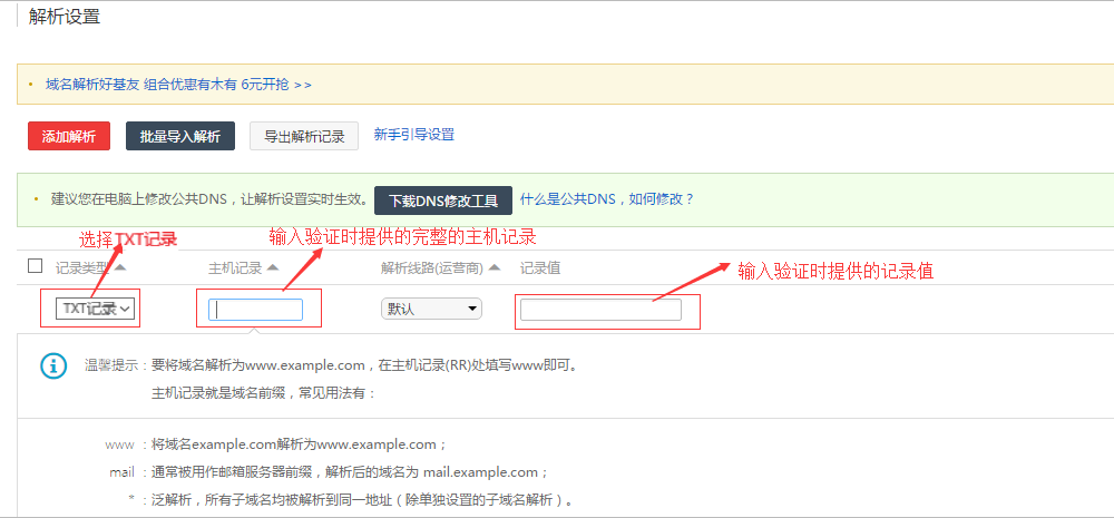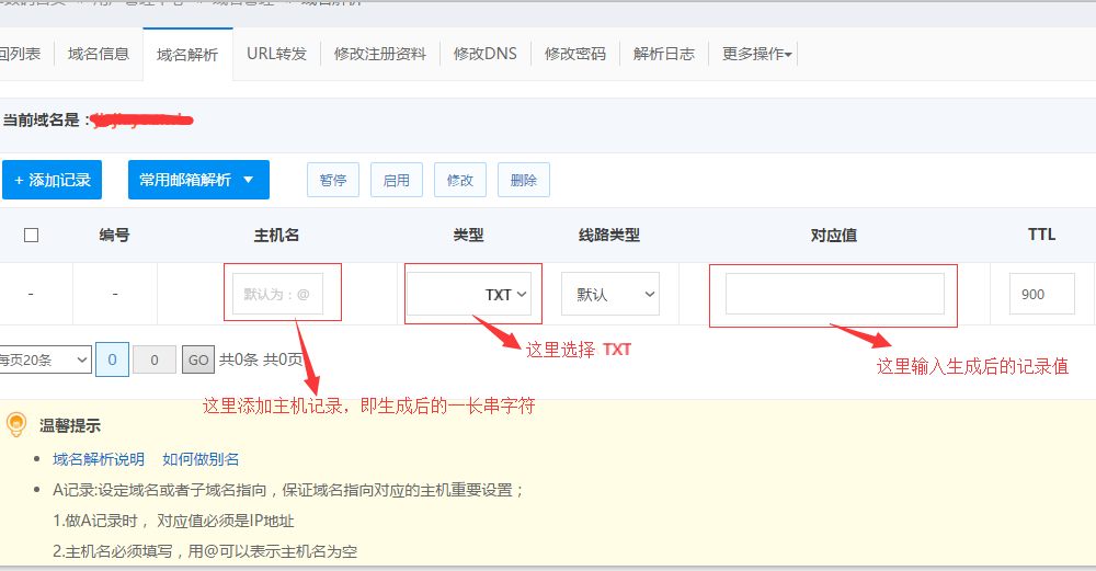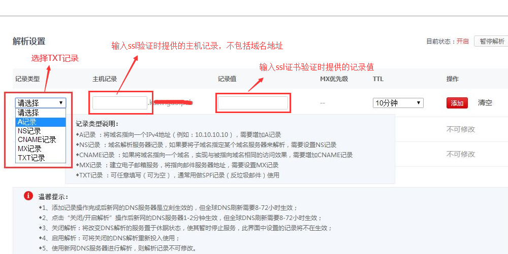 新網(wǎng)賬戶(hù)下的域名解析方法:如圖,將記錄類(lèi)型選擇為T(mén)XT,在主機(jī)記錄中輸入ssl驗(yàn)證時(shí)獲取到的一長(zhǎng)串主機(jī)記錄,不包括網(wǎng)址信息,在對(duì)應(yīng)值中輸入ssl驗(yàn)證時(shí)獲取的一串記錄值。