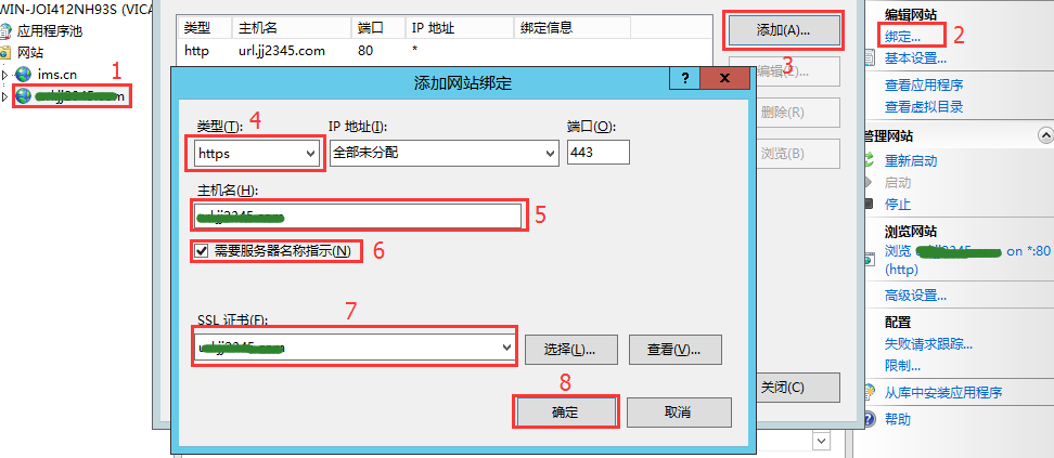 在IIS 8上將兩張證書,分別綁定在兩個不同的網(wǎng)站的默認https端口443上。