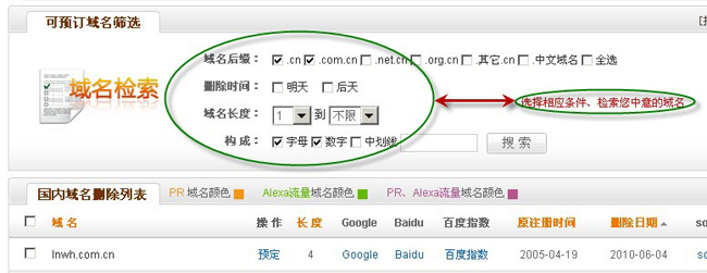 4、根據(jù)可預(yù)訂域名篩選來(lái)更快的找到您想預(yù)訂的域名,如下圖所示:
