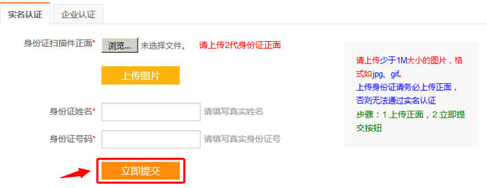 3. 進(jìn)入實(shí)名認(rèn)證頁面,填寫姓名、身份證號(hào)碼,選擇身份證掃描件,提交認(rèn)證