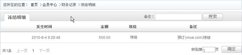 海外代競價預定成功后將會凍結420元,在財務記錄—財務明細中產(chǎn)生一條凍結記錄,如下圖所示: