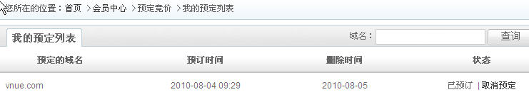 如想取消預訂,請進入會員中心—預定競價—我的預定列表。對應域名選擇取消預定即可。注意取消預定的截止時間為域名刪除日的前一天晚上22:30,超過22:30將無法取消。如下圖所示: