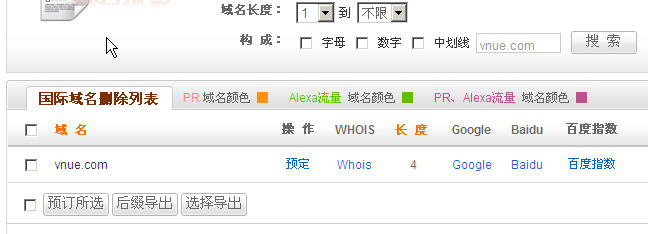首先在國際域名刪除列表中篩選您喜歡的域名,如下圖所示: