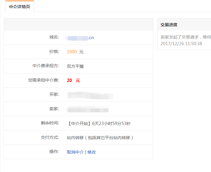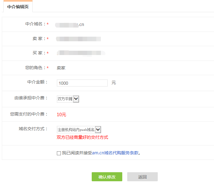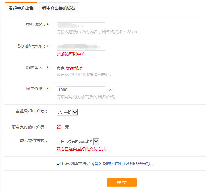 填寫要中介的域名,對方郵件賬號,雙方中介費支付選擇,填寫完之后買賣雙方可以修改中介信息,直到雙方同意中介。最長7天的商量時間。