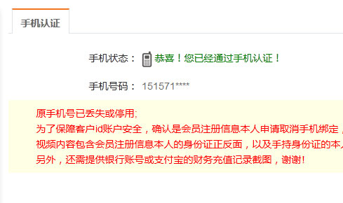 成功通過手機認證,顯示手機已經(jīng)通過認證。如果需要取消綁定,請聯(lián)系客服。