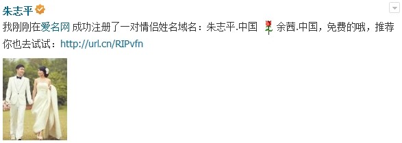我剛剛在 @愛名網(wǎng) 成功注冊(cè)了一對(duì)情侶姓名域名: 朱志平.中國(guó) 余茜.中國(guó),首年是免費(fèi)注冊(cè)的喲,推薦你也去注冊(cè):http://www.sz-lawfirm.com/news/message/2014-02-13-3090.html